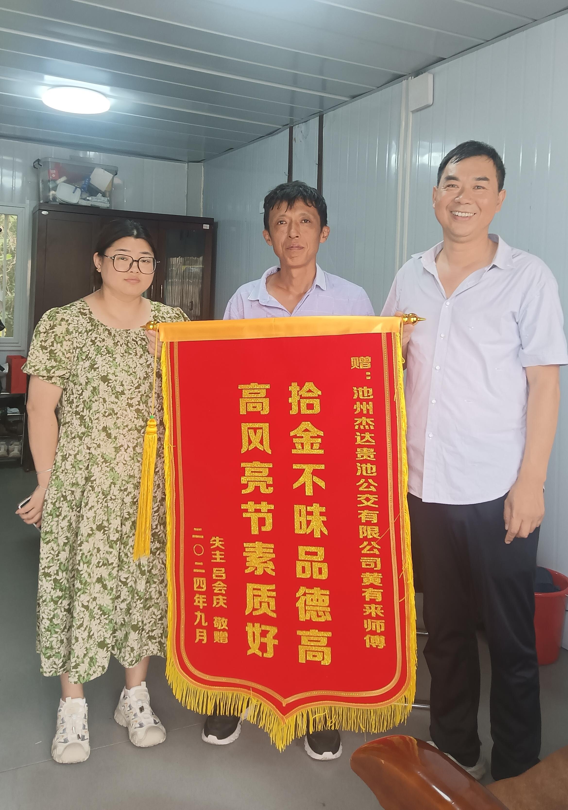 2024年9月12日下午,池州杰達貴池公交公司收到了來自上海呂會慶先生委托其朋友送來的一面錦旗。經(jīng)了解,2024年9月9日下午,公交駕駛員黃有來師傅在執(zhí)行完花廟至貴池的班次任務車輛入庫后,在打掃衛(wèi)生時發(fā)現(xiàn)后座上有一手提袋,外面散落了大量現(xiàn)金,黃有來師傅即刻將手提袋及現(xiàn)金交到調度室。失主在收到丟失物品后非常激動,送來錦旗以表謝意。黃有來作為一名普通的公交駕駛員,在崗位上展現(xiàn)出拾金不昧的精神,不僅體現(xiàn)了個人高尚的道德品質和社會責任感,也傳遞了社會正能量。