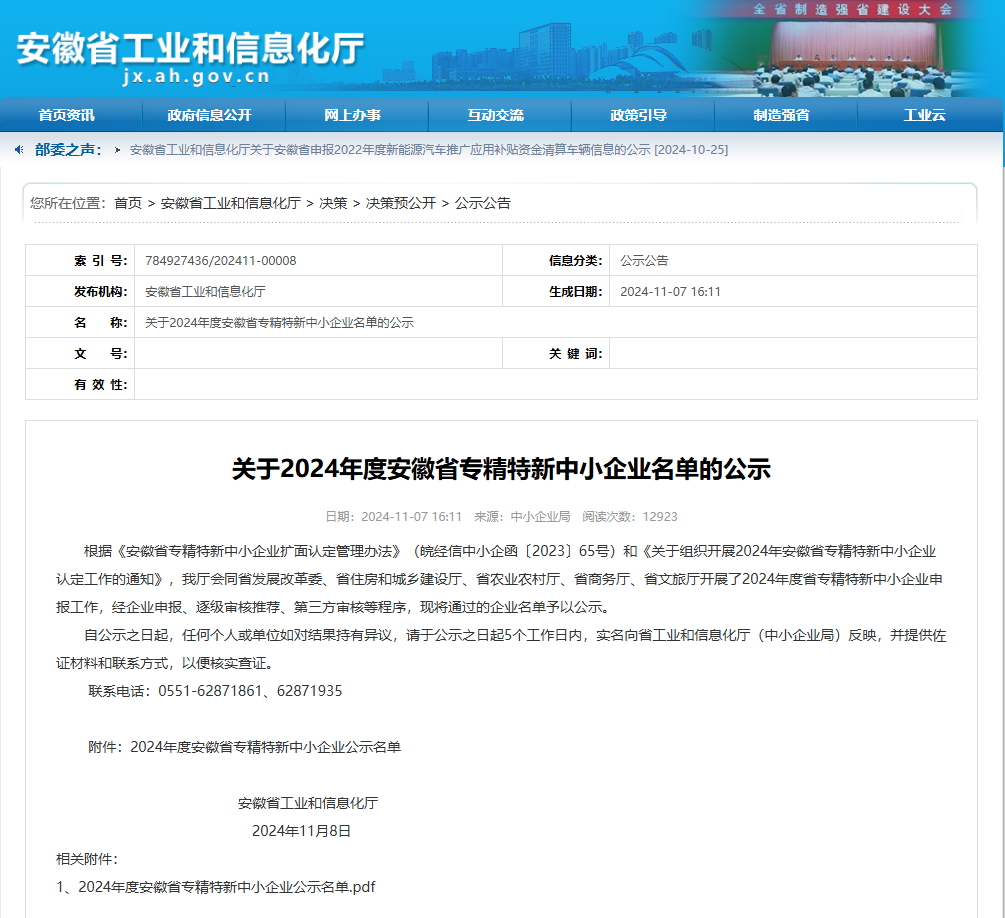 近日安徽省工業(yè)和信息化廳發(fā)布了2024年度專(zhuān)精特新中小企業(yè)公示名單集團(tuán)所屬池州市數(shù)據(jù)產(chǎn)業(yè)有限公司榮獲2024年度安徽省“專(zhuān)精特新”中小企業(yè)。