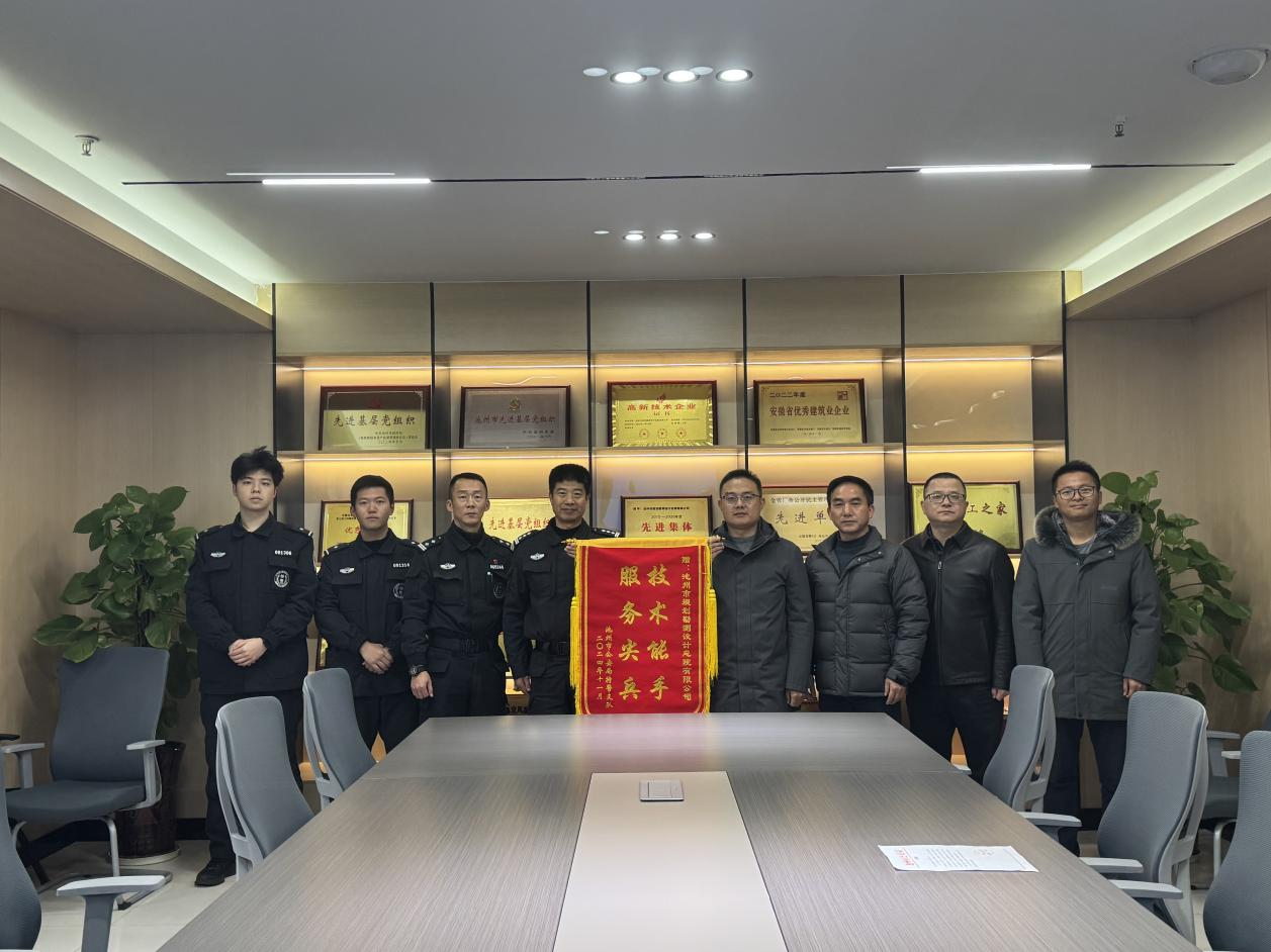12月10日,池州市公安局特警支隊(duì)支隊(duì)長(zhǎng)陳后剛一行赴設(shè)計(jì)總院送來錦旗和感謝信,感謝設(shè)計(jì)總院在該局執(zhí)行某專項(xiàng)任務(wù)時(shí)給予的裝備和技術(shù)支持,并對(duì)設(shè)計(jì)總院在支援期間展示的扎實(shí)的工作作風(fēng)和過硬的專業(yè)素養(yǎng)表示充分肯定。