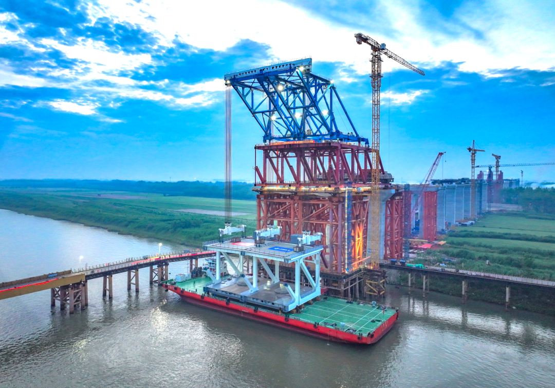 大橋連接銅陵市樅陽縣和池州市貴池區(qū),全長3108.5米,采用上層6線高速公路、下層2線高速鐵路和預(yù)留2線城際軌道布局,其中跨江主橋長1768米,采用主跨812米雙層鋼桁梁斜拉橋,主橋共計(jì)69個(gè)節(jié)段,總重91448.6噸。