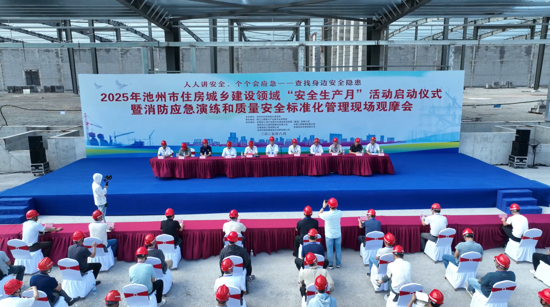 近日,《2025年池州市住房城鄉(xiāng)建設(shè)領(lǐng)域“安全生產(chǎn)月”活動(dòng)啟動(dòng)儀式暨消防應(yīng)急演練和質(zhì)量安全標(biāo)準(zhǔn)化管理現(xiàn)場觀摩會(huì)》在集團(tuán)所屬地質(zhì)公司承建的“京東云倉EPC項(xiàng)目”現(xiàn)場隆重舉行。副市長胡軍保、集中區(qū)管委會(huì)副主任張平、市住建局局長付四九及三縣一區(qū)住建安全部門和企業(yè)代表共同參與此次活動(dòng)。