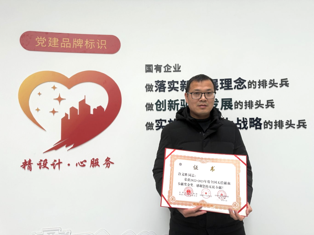 近日,集團(tuán)所屬設(shè)計(jì)總院?jiǎn)T工許文勝同志榮獲由國家衛(wèi)生健康委員會(huì)、中國紅十字會(huì)總會(huì)、中央軍委后勤保障部衛(wèi)生局頒發(fā)的“2022—2023年度全國無償獻(xiàn)血獎(jiǎng)金獎(jiǎng)”,以表彰他二十年如一日的無償奉獻(xiàn)。