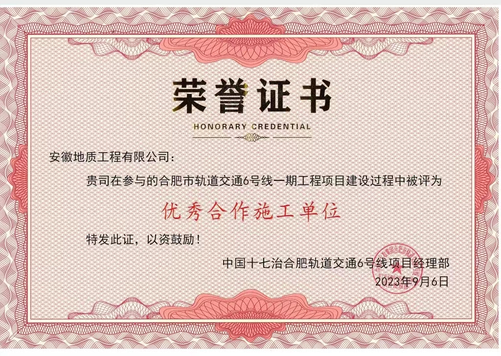 近日,建投集團所屬安徽地質工程有限公司喜獲中國十七冶合肥軌道交通6號線項目經理部頒發(fā)的“優(yōu)秀合作施工單位”榮譽稱號,這是對地質工程公司在該項目施工過程中的突出表現(xiàn)的肯定。