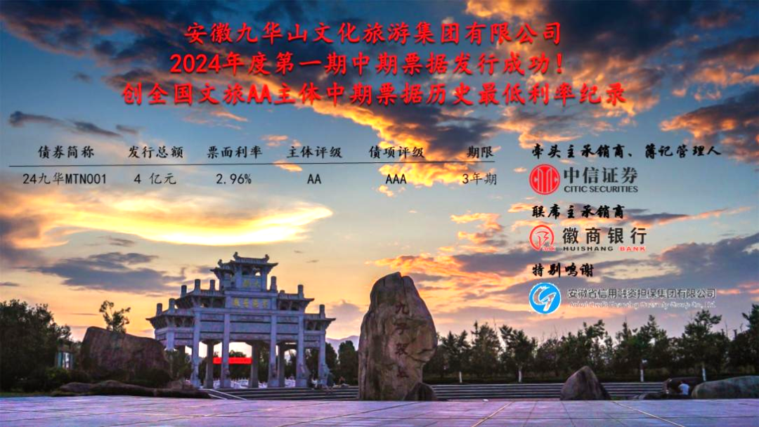 2024年1月26日,文旅集團(tuán)2024年度第一期中期票據(jù)(24九華MTN001)成功發(fā)行。募集資金規(guī)模4億元,期限3年,票面利率2.96%,認(rèn)購倍數(shù)4.9倍,創(chuàng)全國(guó)文旅AA主體中期票據(jù)歷史最低利率記錄!
