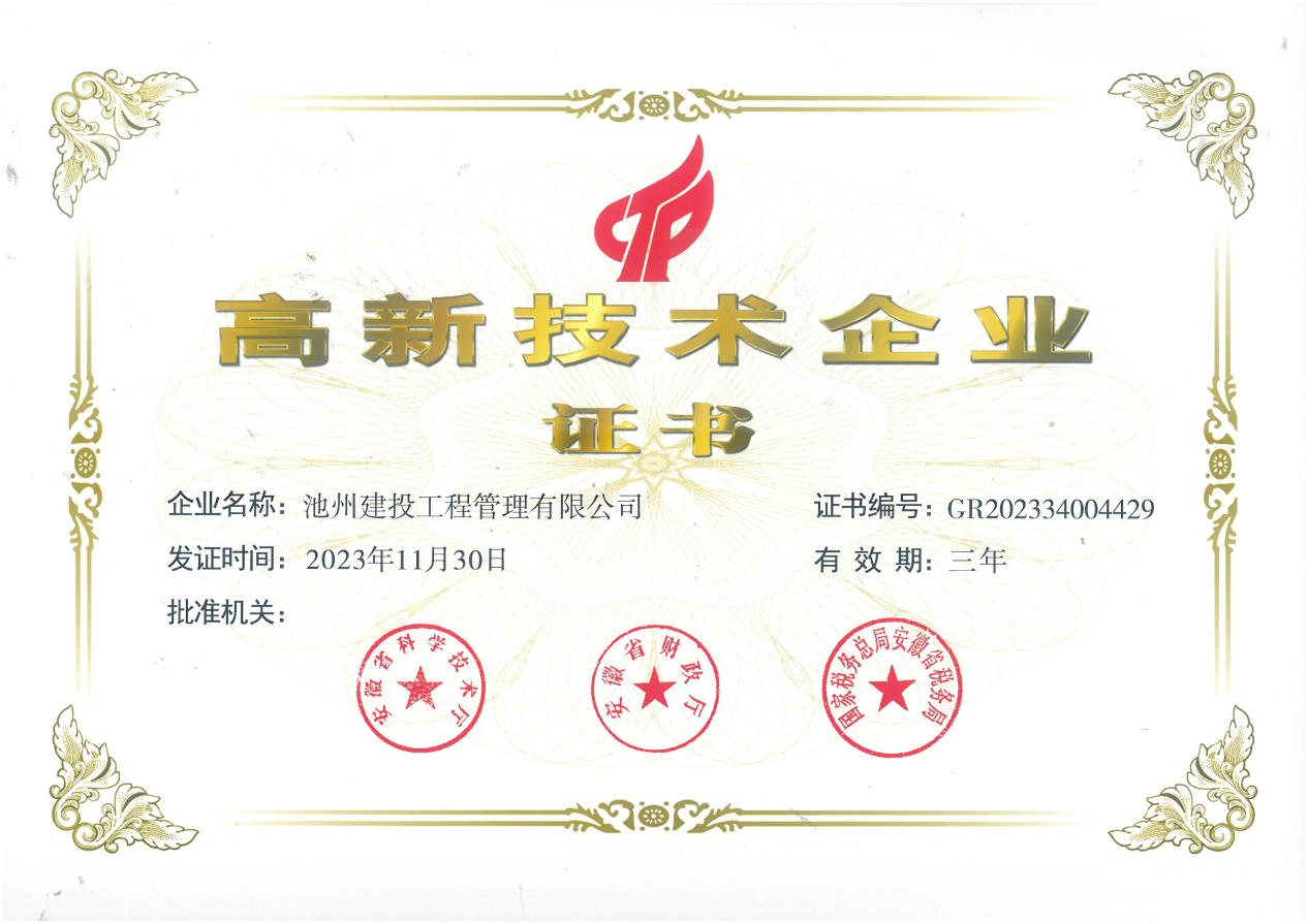 通過高新技術(shù)企業(yè)認(rèn)定,體現(xiàn)了主管部門對(duì)池州建投工程管理有限公司自主創(chuàng)新能力、研發(fā)投入、成果轉(zhuǎn)化水平的充分認(rèn)可,對(duì)于提升企業(yè)行業(yè)地位、品牌形象和市場(chǎng)競(jìng)爭力具有重要意義。