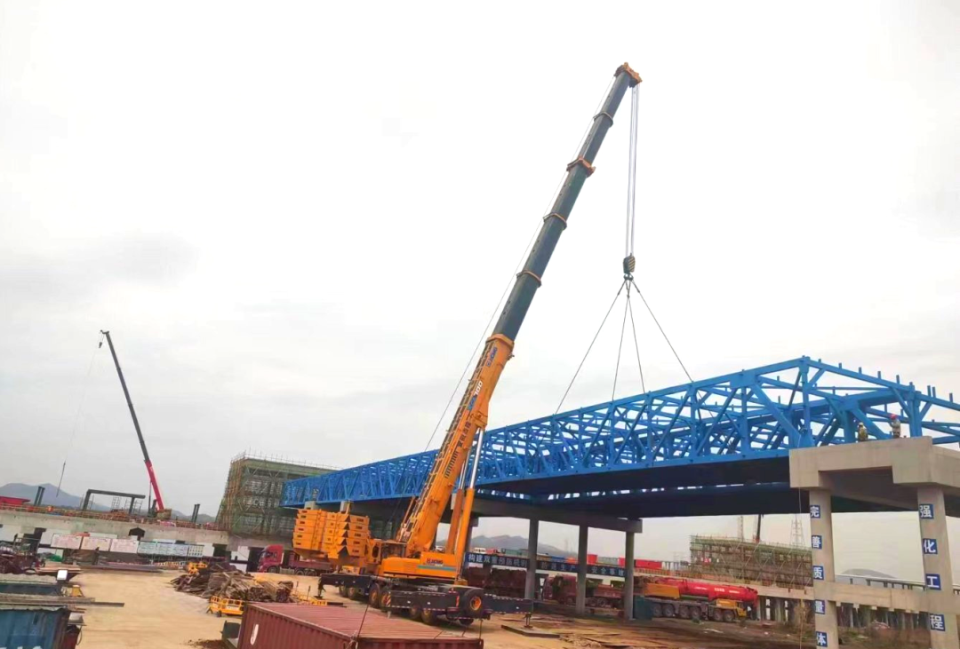 此次吊裝的兩座鋼引橋長(zhǎng)度均為54.6米,8米寬型重108噸,12米寬型重163噸,屬超危大工程,且引橋橫跨長(zhǎng)江大堤,坡頂?shù)狡履_的坡度小,存在“場(chǎng)地小、機(jī)械多、人員多、工序多”的情況,進(jìn)一步增加了安全風(fēng)險(xiǎn)和施工難度。