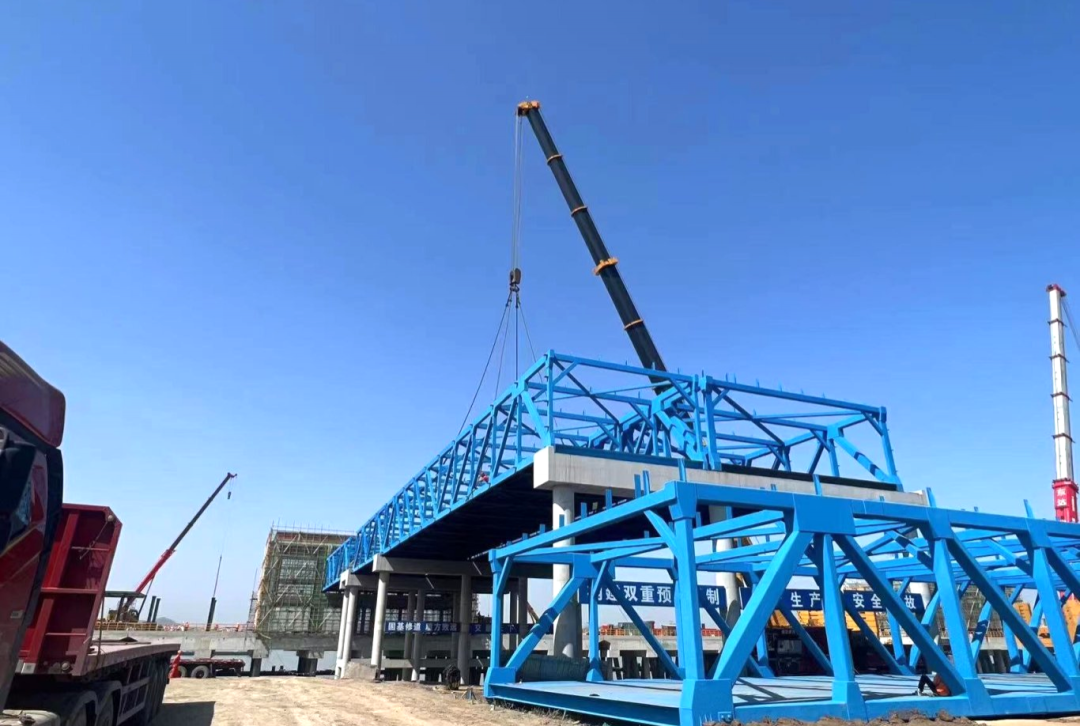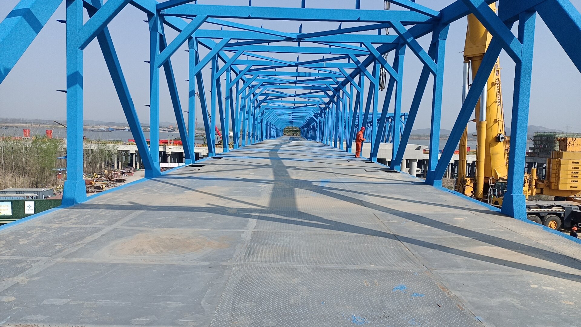 3月22日,烏沙港跨堤段鋼引橋安全平穩(wěn)吊裝至指定位置,安裝精度符合設(shè)計(jì)要求,經(jīng)過(guò)近二十個(gè)小時(shí)的奮戰(zhàn),跨堤段鋼引橋吊裝成功,為水域部分與陸域部分搭建了“橋梁”。