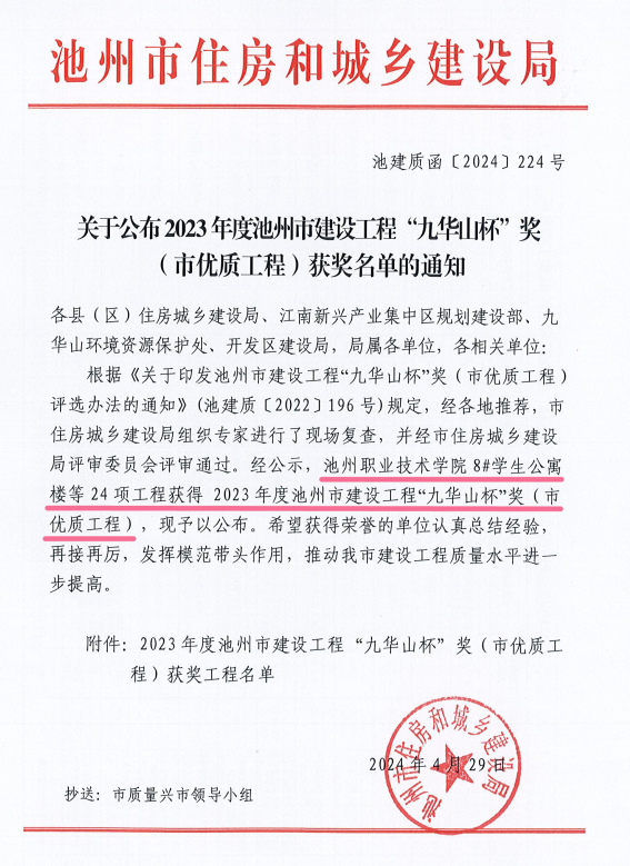 近日,池州市住房和城鄉(xiāng)建設(shè)局印發(fā)了《關(guān)于公布2023年度池州市建設(shè)工程“九華山杯”獎(市優(yōu)質(zhì)工程)獲獎名單的通知》(池建質(zhì)函〔2024〕224號),由池州建投集團承建的池州職業(yè)技術(shù)學(xué)院8#學(xué)生公寓樓項目喜獲2023年度池州市建設(shè)工程“九華山杯”(市優(yōu)質(zhì)工程)獎。